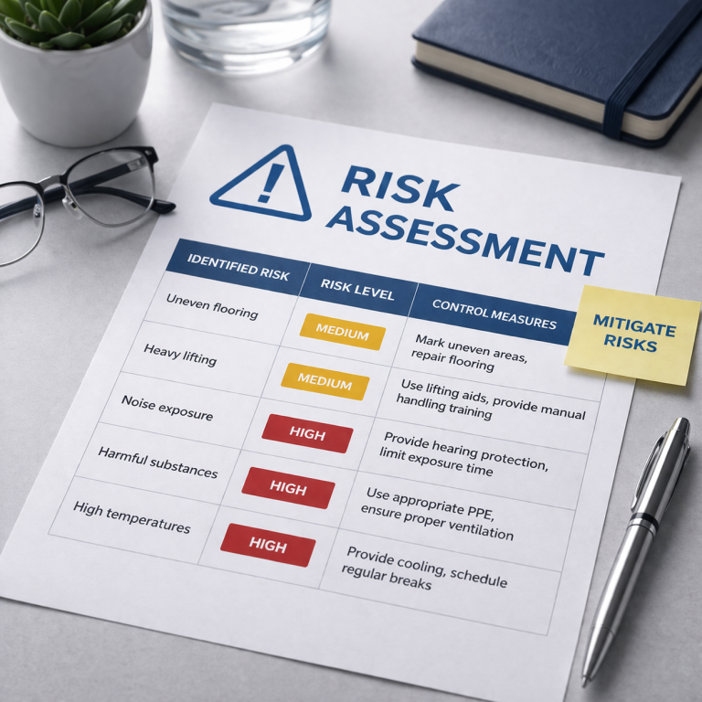 Our risk assessments are designed to give you a clear understanding of the hazards within your workplace and the steps needed to control them. We work with you to identify potential risks, assess their impact, and put practical measures in place to reduce them, helping you protect your staff, meet your legal duties, and maintain a safe working environment.
