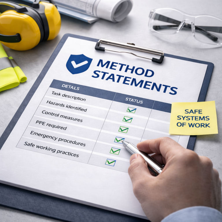 Method statements and safe systems of work set out exactly how tasks should be carried out safely, step by step. We work with you to develop clear, practical documents that reflect how your work is actually done, helping your team follow consistent procedures, reduce risk, and carry out tasks safely and efficiently.